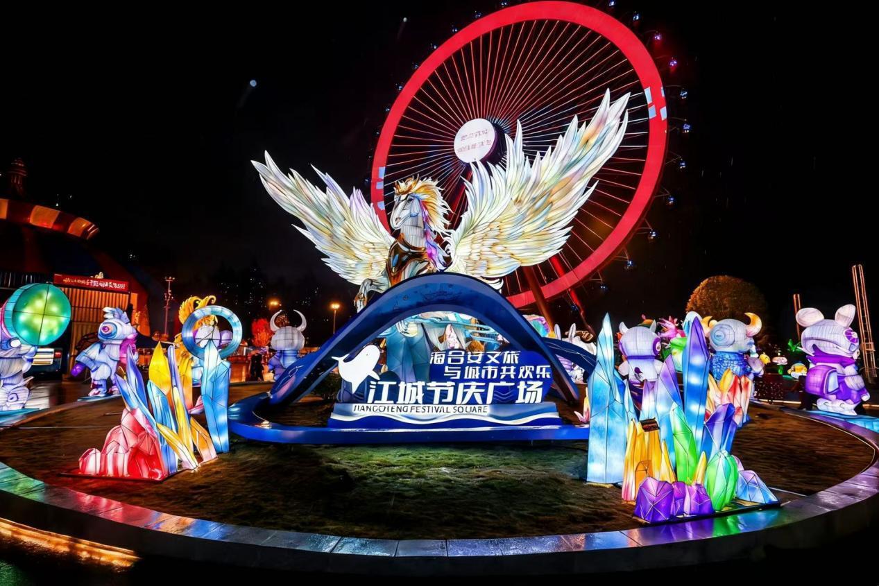 夜幕降临,园区更是灯火璀璨。华中首创的海洋非遗灯会设有“瑞兽灯阁”“赛博山海”“怪咖丛林”三大主题灯区,10米银翼飞马灯组格外吸睛,勾勒出梦幻的童话秘境。91米高的“楚天之眼”摩天轮同步点亮,游客乘上摩天轮升至高空,俯瞰灯火海洋、云端许愿,温情的篝火舞会让大家围炉共舞,感受团圆美好。