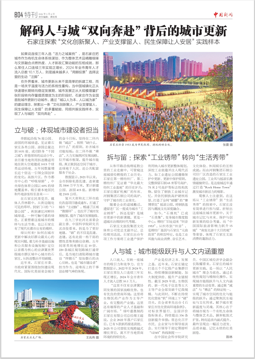 在中国社会科学院研究员、中国区域经济学会副会长陈耀看来,石家庄的城市更新实践,是一场以“人民城市”理念为底色,通过系统性规划与精细化操作,实现城市能级跃升与人文内涵重塑的生动变革。通过做“减法”与“乘法”的辩证统一,实现了城市空间的优化与能级的跃升;通过聚焦民生福祉与文化传承,赋予城市更新温度与灵魂。其核心在于将城市视为一个有机生命体与整体艺术品,摒弃粗放式扩张,转而追求内涵式提升,最终呈现出一幅活力迸发、品质卓越、记忆永续的壮美画卷。