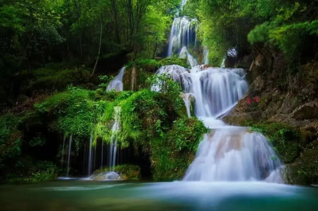 “楚天九寨沟”,以七彩瀑布闻名。春季水量充沛,瀑布如练,峡谷内野花盛开,是洗肺康养的绝佳去处。