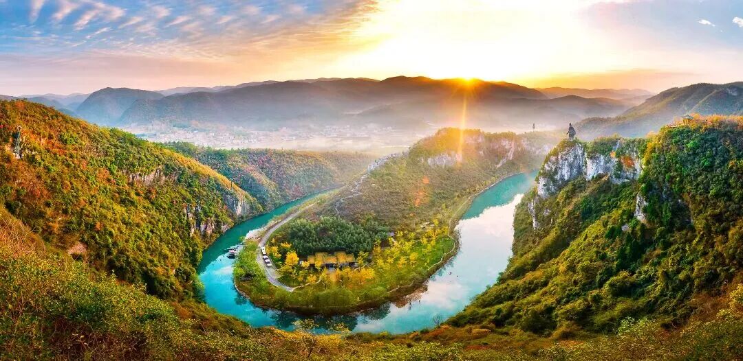 三面环水的“奇、秀、险”古山寨,被誉为“中国最美的古山寨”。春日新绿映衬古寨石墙,乘索道俯瞰茅坪河蜿蜒如带,景色壮美。