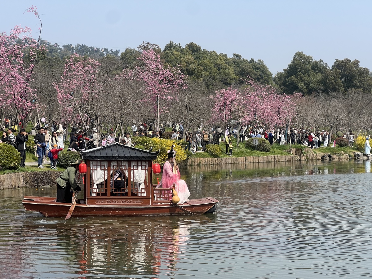 放眼望去,人流如织却秩序井然,大家或簇拥在花树下拍照打卡,定格樱花与春日的美好;或携手漫步樱林,在花香中畅谈闲聊;或驻足古诗词道,品读历代咏樱诗篇,在自然美景与传统文化中感受春日韵味。身着汉服的年轻人穿梭在樱林间,衣袂飘飘与粉樱相映,成为园内一道靓丽的风景线;亲子家庭手牵着手,孩子们踮起脚尖触摸枝头的樱花,脸上满是欢喜;摄影爱好者举着相机,在人群中寻找最佳角度,捕捉樱花的灵动与人群的热闹,每一处角落都充满了春日的生机与烟火气。