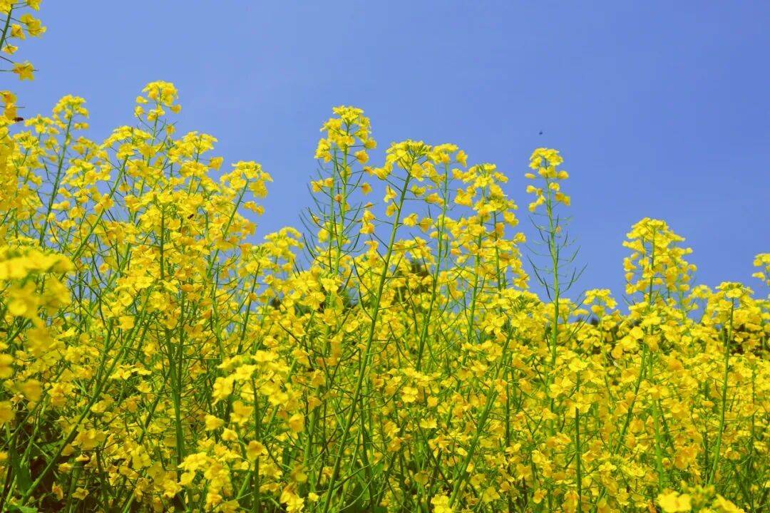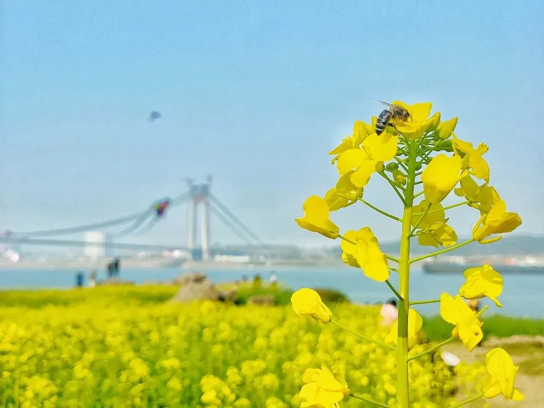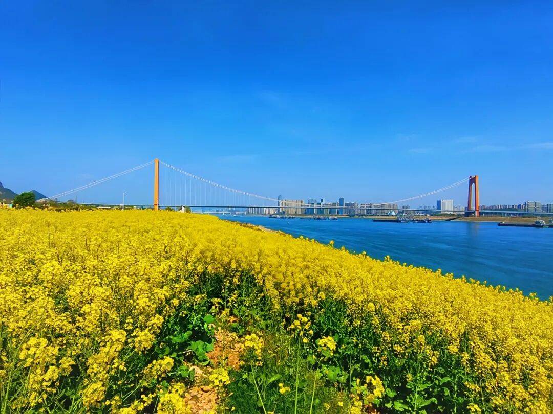 三月的卷桥河湿地,是被阳光偏爱的模样。大片油菜花迎着暖阳肆意绽放,层层叠叠的金黄铺展至江边,田埂交错其间,风一吹,金色花浪翻滚,连空气里都飘着清甜的花香,蜜蜂嗡嗡作响,氛围感直接拉满。✨