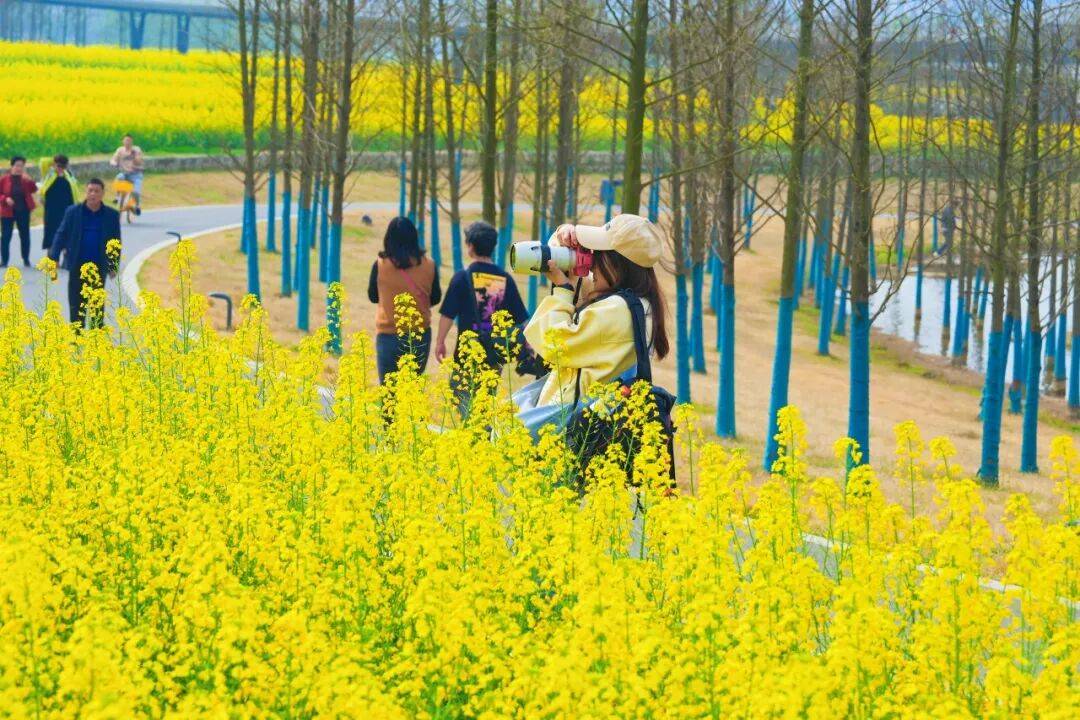 漫步花海深处,近身细嗅花香,看阳光穿过花瓣洒下斑驳光影,随手一拍都是治愈系田园大片。登上彩虹桥,俯瞰整片花海与蜿蜒型河道,湿地的生态之美尽收眼底,江水粼粼与金色花海相映,构成一幅流动的春日画卷。