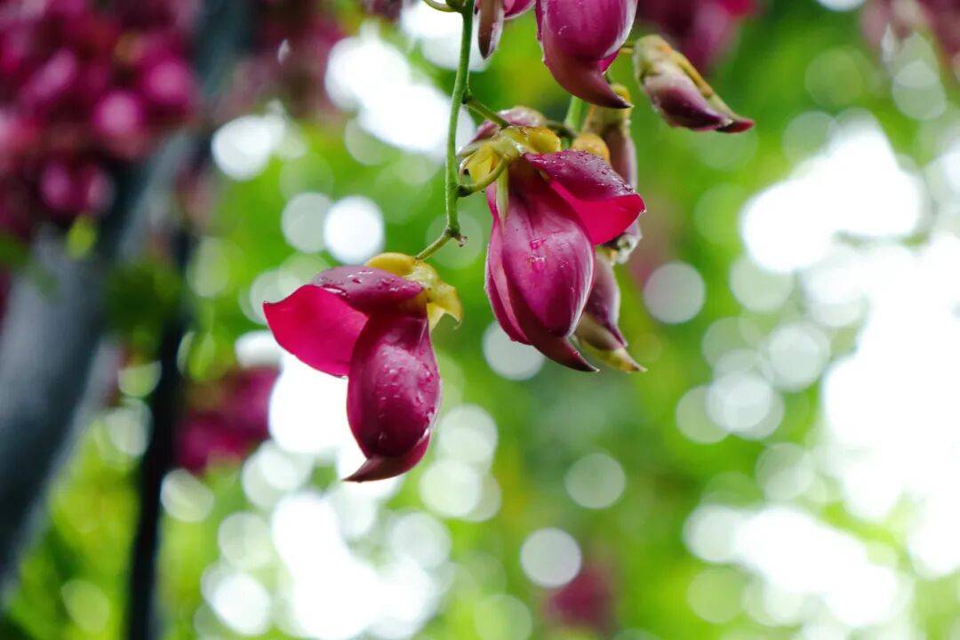 待到四月,晚樱与禾雀花接力绽放,串串禾雀花悬挂枝头,形似灵动的雀鸟振翅欲飞,模样娇俏可爱。沿山间小径上行,抵达紫阳龙洞,还能见到两株粗壮的千年龙藤王,藤上缀满禾雀花,形成三峡地区最大的野生禾雀花龙藤群落,震撼又治愈。