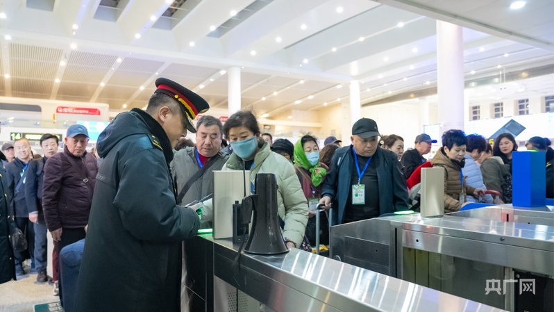 呼和浩特东站客运人员服务游客检票进站(央广网发杨颐摄)
