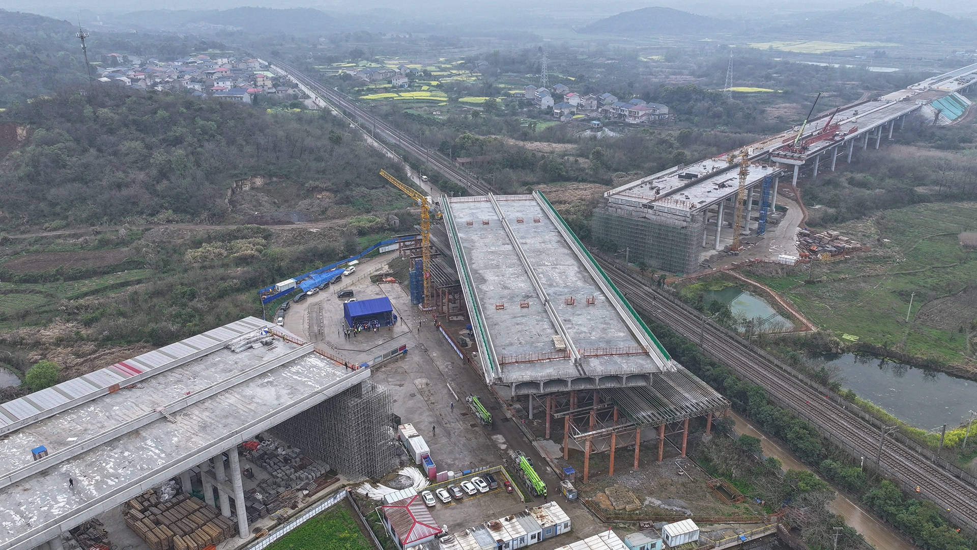 跨武九铁路转体桥是全线重难点控制性工程,全长150米,宽38.7米,转体重量达2.6万吨,为鄂东地区最重的转体桥。桥梁上跨运输繁忙的武九铁路既有线,梁底距铁路接触网仅1.625米,面临梁体重、曲线控制难、天窗时间短、安全风险高等挑战。