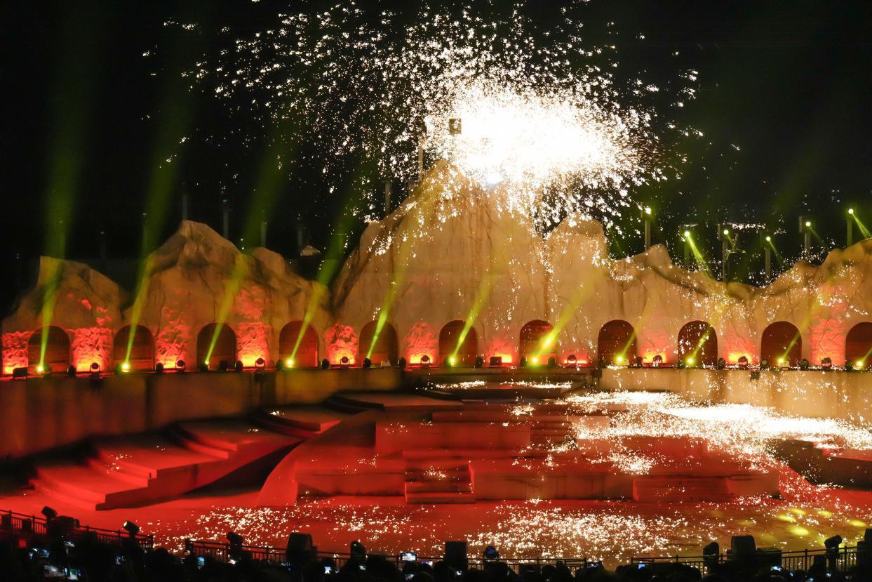 作为本次清明假期的重磅亮点,花博汇年度核心演艺《盛世楚歌》首次亮相。该剧以辛亥烽火为时空锚点,串联起鬻熊筚路蓝缕、楚庄王问鼎中原、屈原上下求索等三千年荆楚经典故事,深度诠释荆楚文化与知音精神。演出融合影视级战争特效、山体投影、激光矩阵等前沿科技,搭配迫击炮、烟爆等实景设备还原历史壮阔场景,同时融入打铁花、火把舞等非遗绝技,通过高空威亚、火技演绎等形式,让游客沉浸式穿梭千年历史,感受视听双重冲击。