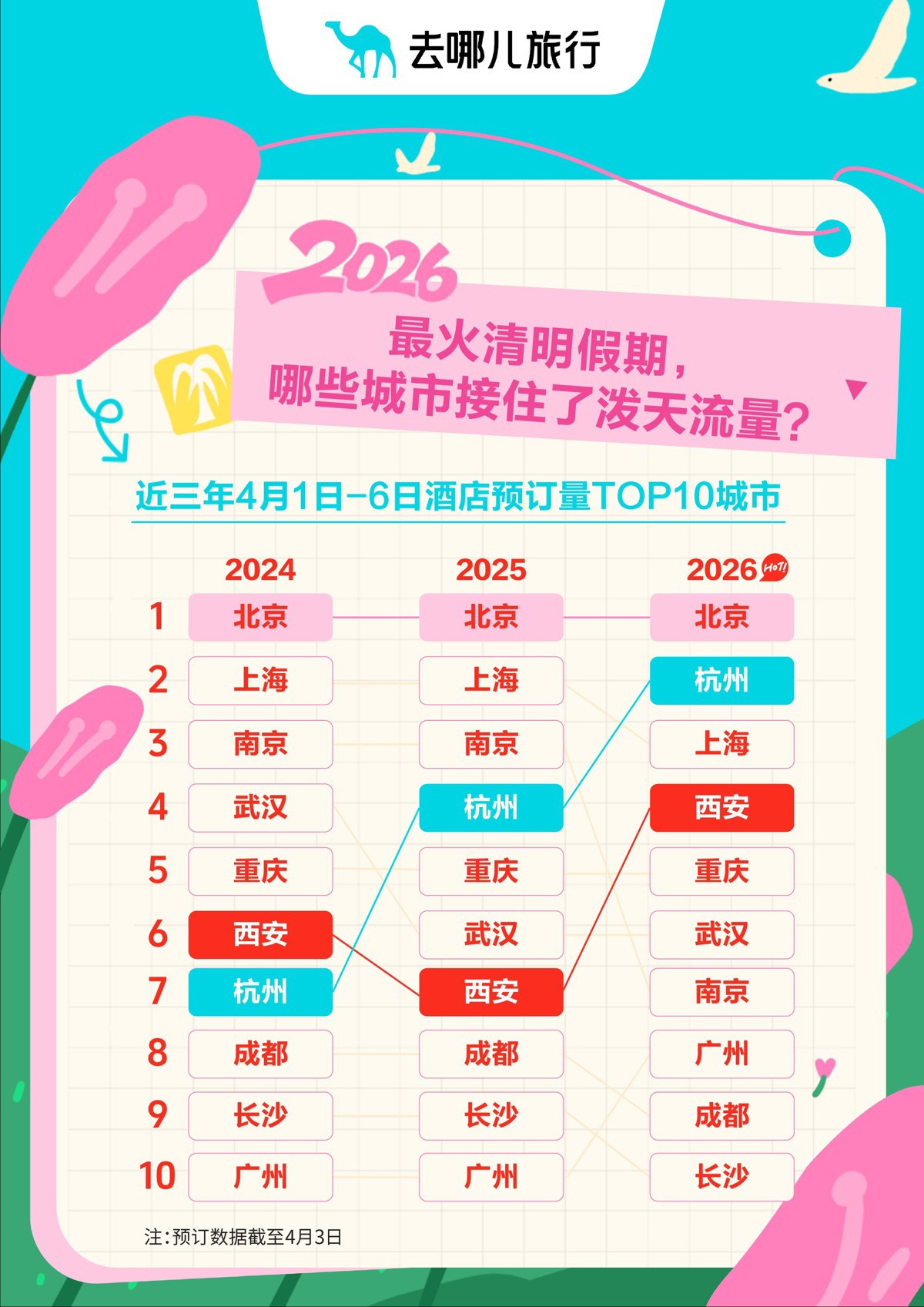 哪些城市接住了春假+清明的“泼天流量”?从酒店预订来看,旅游资源丰富的大城市,以及适合踏春的江南水乡,都是顶流。截至4月3日,清明假期酒店预订量最高的Top10城市为:北京、杭州、上海、西安、重庆、武汉、南京、广州、成都、长沙。