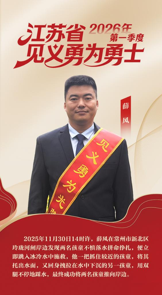 2025年11月30日14时许,薛风在新北区玲珑河闸岸边发现两名孩童不慎落水,正在拼命挣扎。薛风毫不犹豫跳入冰冷的水中,先一把抓住离自己较近的孩童,将其托出水面;随后又转身拽住正在下沉的另一名孩童,用双腿不停踩水,奋力将两人推向岸边。最终,两名孩童均成功获救。