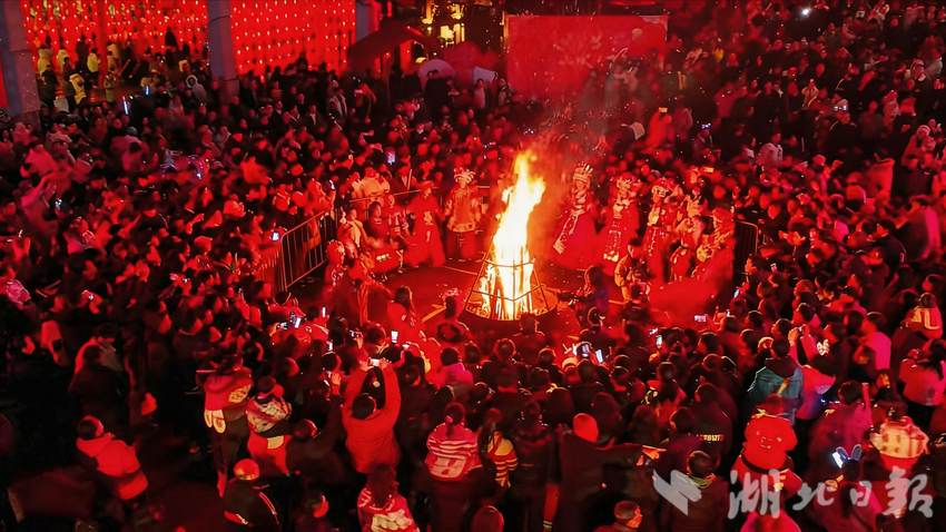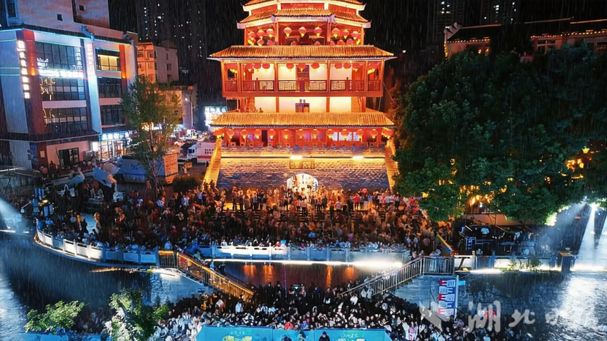 演艺的浪漫尚未散去,寨遇广场的狂欢已然开启。19:30,篝火准时点燃,宣恩特色的“蹦仙迪”燃爆全场热情。这场融合了土苗民族文化与现代潮流的活动,让来自五湖四海的游客抛开陌生,牵起身边人的手,在音乐与火光的交织中尽情舞动,将春日的美好与欢乐定格在宣恩的夜色里。