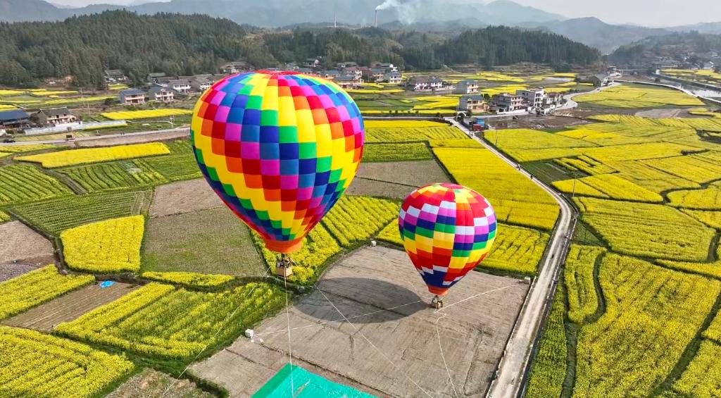 乡村田园的春日经济同样绽放富民生机。在怀化市会同县堡子镇万亩油菜花田,热气球缓缓升空,无人机编队在花海上方变换造型,游客漫步花田、欢声笑语此起彼伏。花海旁的乡村市集里,农户沿街摆摊,菜籽油、土蜂蜜、手工糍粑等原生态农特产品琳琅满目。
