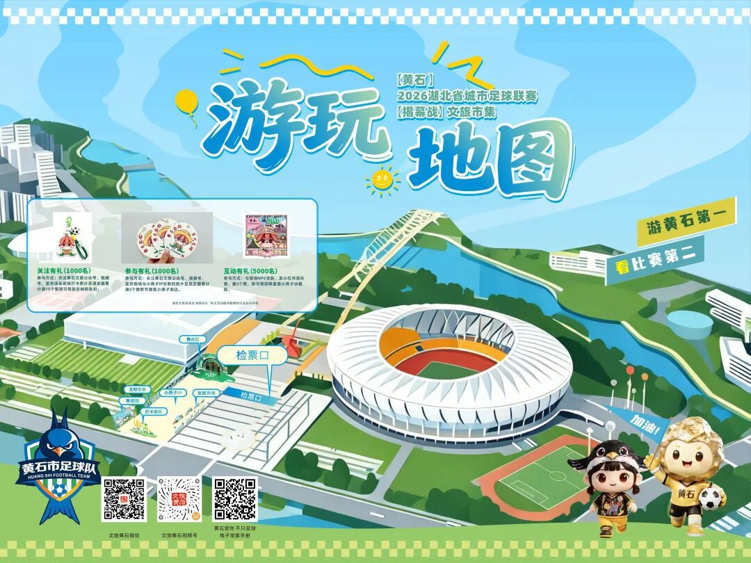 4月12日,2026楚超揭幕战将在黄石奥体中心打响。“黄石宠你,不只足球”文旅沉浸式体验市集,当日11:00-21:00,在奥体中心外广场同步上线。