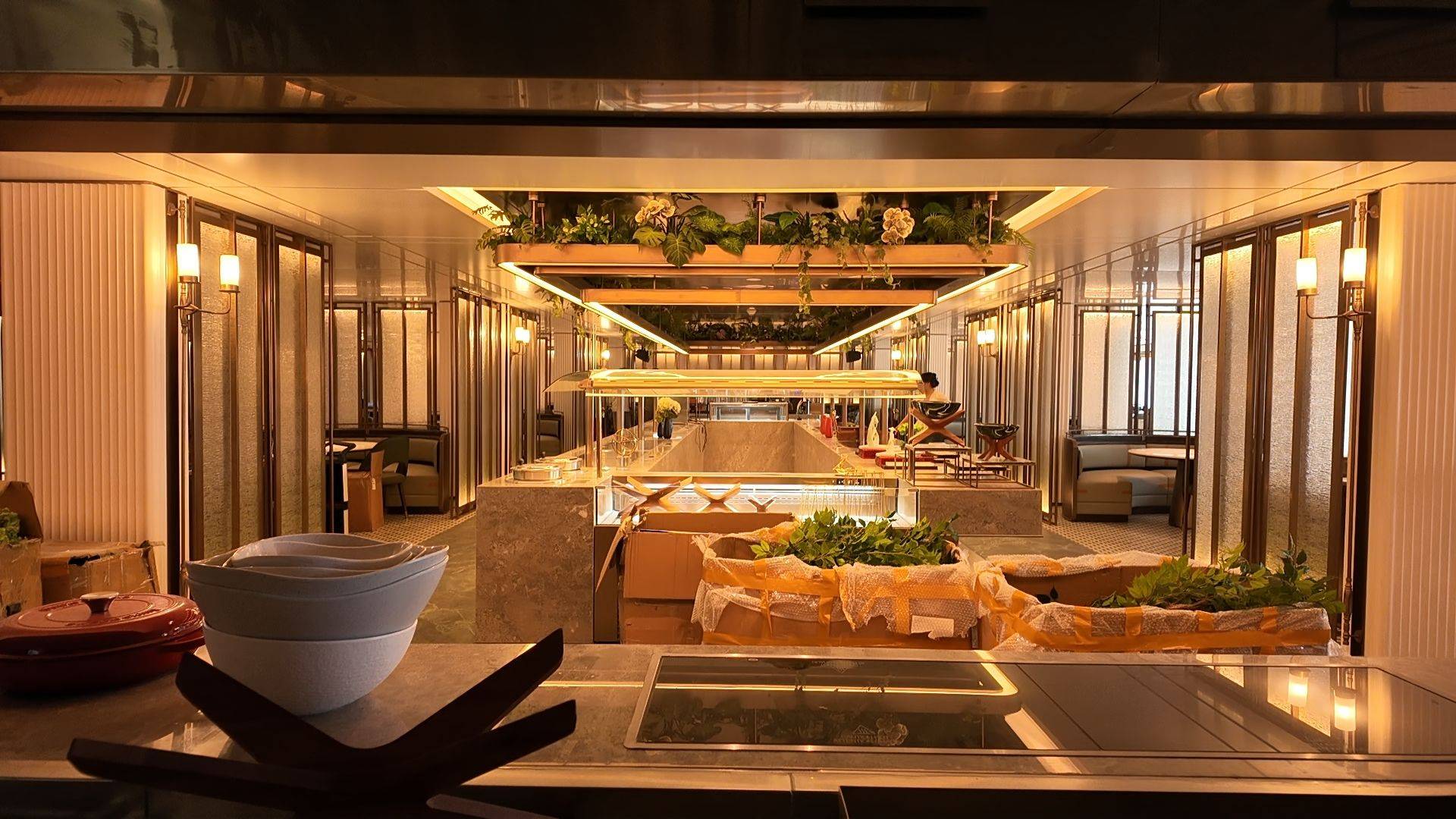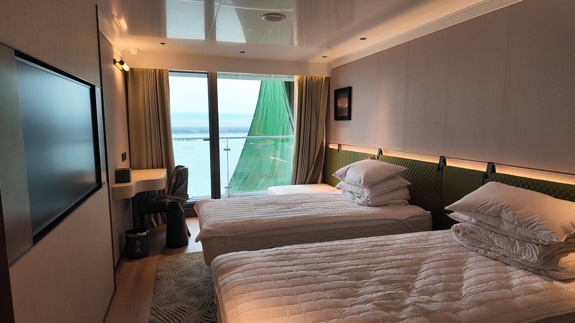 “长江行•揽月”作为国内投资最大的内河旗舰游轮,单船投资约3亿元。全船总长约150米、型宽23米,共设客房259间,最大可载客650人。走进船舱,记者第一时间感受到了与传统游轮截然不同的气质。舱内公共区域采用大面积落地观景玻璃装饰,自然光倾泻而入,江景一览无余。客房内部布局考究,从标准间到套房,均配有独立卫浴、智能温控及静音空调系统,床品、家具及灯光设计均对标高端酒店。