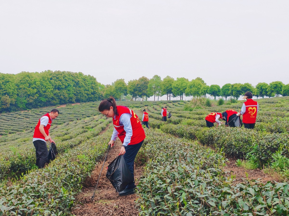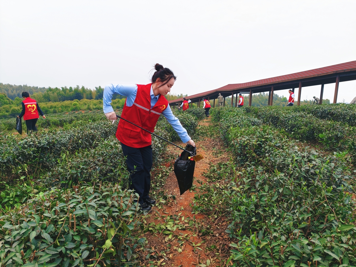 活动现场,一个个红色身影在茶园中穿梭,志愿者们手持垃圾夹、垃圾袋,沿着茶园小道、茶垄间和排水沟渠等区域展开地毯式清理,塑料袋、饮料瓶、废弃包装……志愿者们俯身弯腰、分工协作,将散落在茶园各处的白色垃圾一一捡拾归集。大家不怕脏、不怕累,不放过任何一个卫生死角,用实实在在的行动为刚结束采摘的茶园拂去“白色污染”,守护茶园的生态环境。