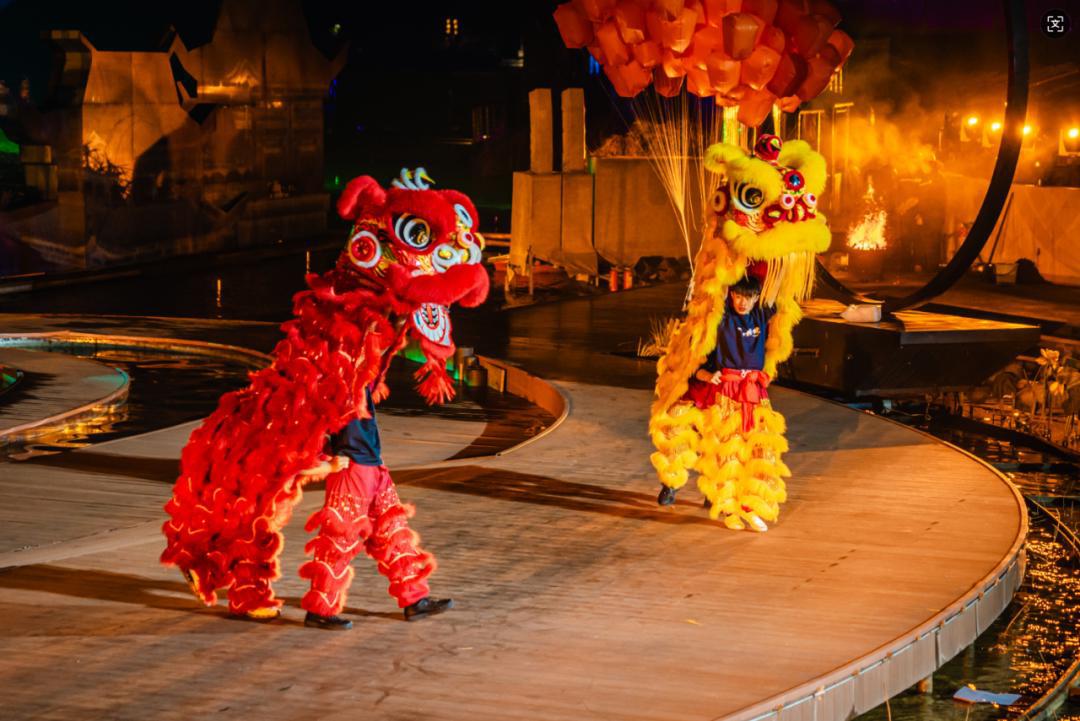 1号舞台·气势为先:南狮梅花桩腾挪如电,北狮高桌威猛刚劲,高杆不倒翁迎风摇曳,开路神鞭凌空炸响。压轴的聚仙巡游,40人仙侠方阵衣袂翩然,拉开全天序幕。