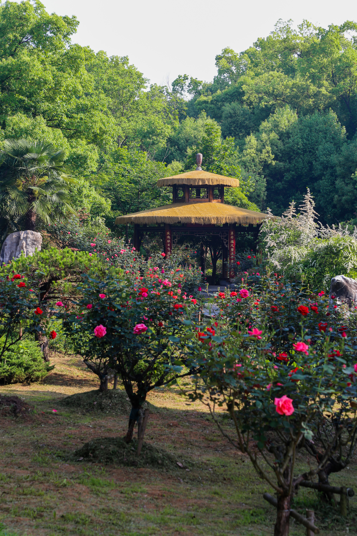 除了惊艳的玫瑰与月季外,整个园区更是一座精巧别致的微型生态花园。高大挺拔的银杏、水杉、樱花、香樟等乔木错落生长,撑起片片绿荫,为游客遮阴纳凉;迎春、杜鹃、金丝桃等灌木花卉点缀其间,增添缤纷色彩;麦冬、鸢尾等地被植物铺就柔软的绿意地毯,生机勃勃;芦苇、菖蒲、荷花、睡莲等水生植物依水而生,打造灵动雅致的水生美景。园区内乔、灌、草层层搭配、高低错落,水陆景观相融相生,构成一幅和谐自然的生态画卷。