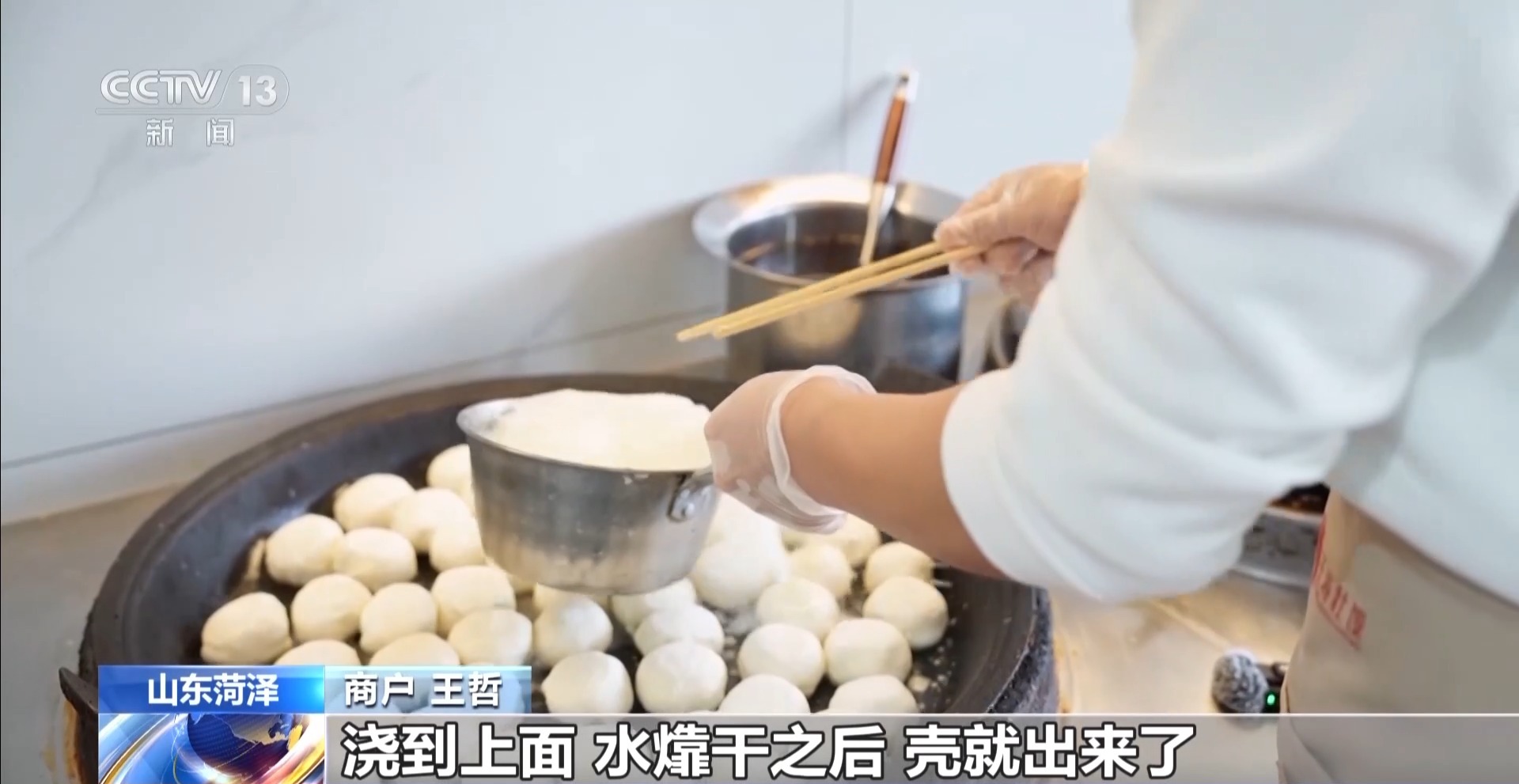 商户 王哲:舀上一瓢水,加上面粉,浇到上面,水㸆干之后,壳就出来了。然后洒上油,吃起来会特别香。