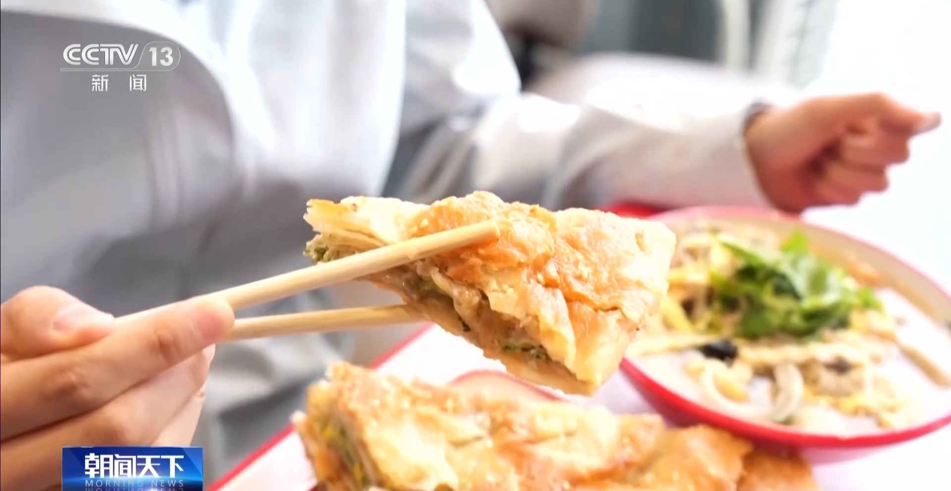总台记者 李美慧:拿到这碗单县羊肉汤,我发现它最明显的一个特点就是汤的颜色是乳白色的,而且完全没有羊肉的膻味。它的碗底还有一层分量很足,而且肉质很紧实的羊肉。这一口汤下去真的满嘴都是香味,如果早上来上这样一碗汤,整个人都能暖和起来。除了羊肉汤,羊油饼其实也有来头,它里面一层薄薄的馅料是用羊油和辣椒做成的。一口饼,一口汤,就能开启活力满满的一天。
