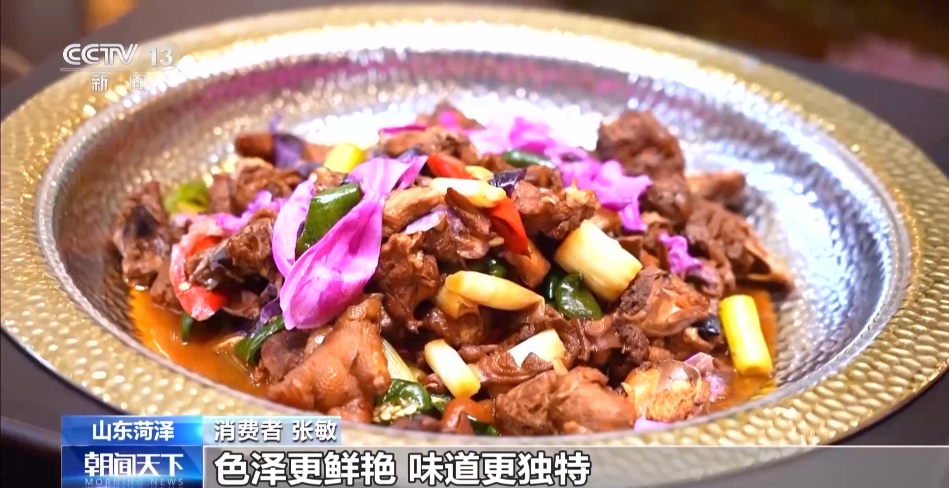 消费者 张敏:菏泽的地域风情和特色融入到整桌菜里面,色泽更鲜艳,味道更独特,我们吃着也很开心。