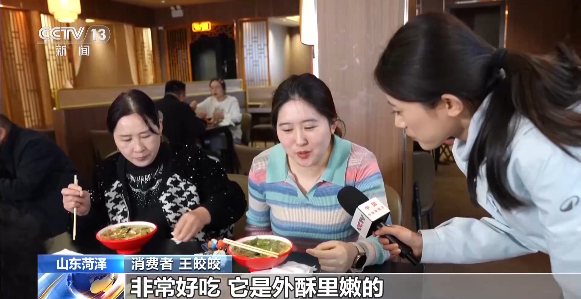 消费者王皎皎:非常好吃,它是外酥里嫩的。还有焖子汤,是我们的一个特色。