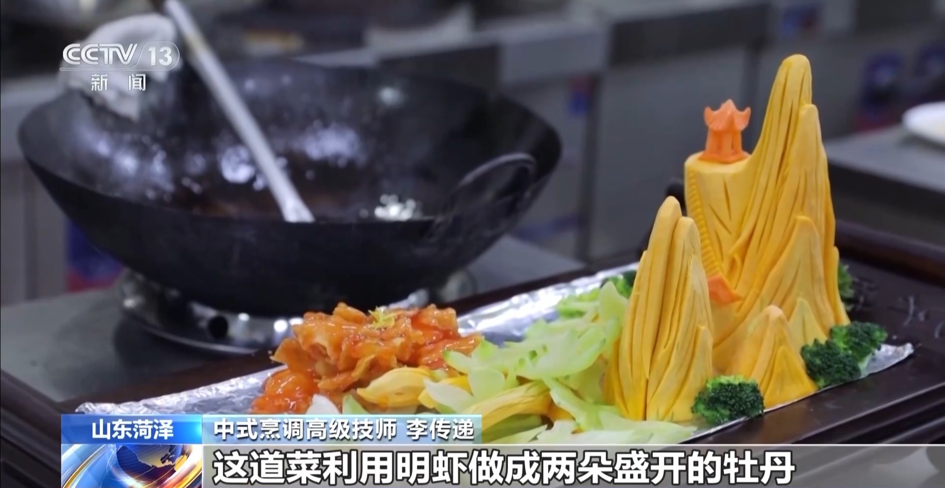 中式烹调高级技师 李传递:这道菜叫《花开盛世》,是曹州牡丹宴的代表菜之一,这道菜利用明虾做成两朵盛开的牡丹,一个是白牡丹,一个是红牡丹。白牡丹是咸鲜口味,红牡丹是糖醋口味。