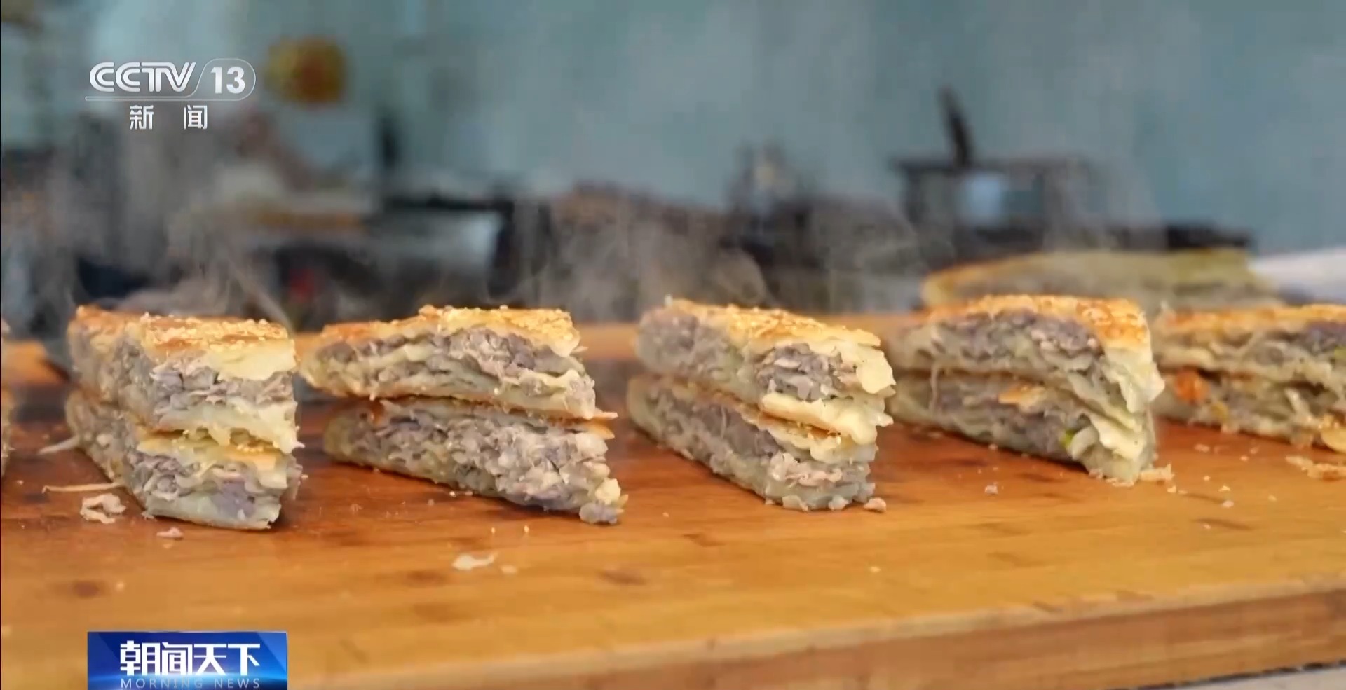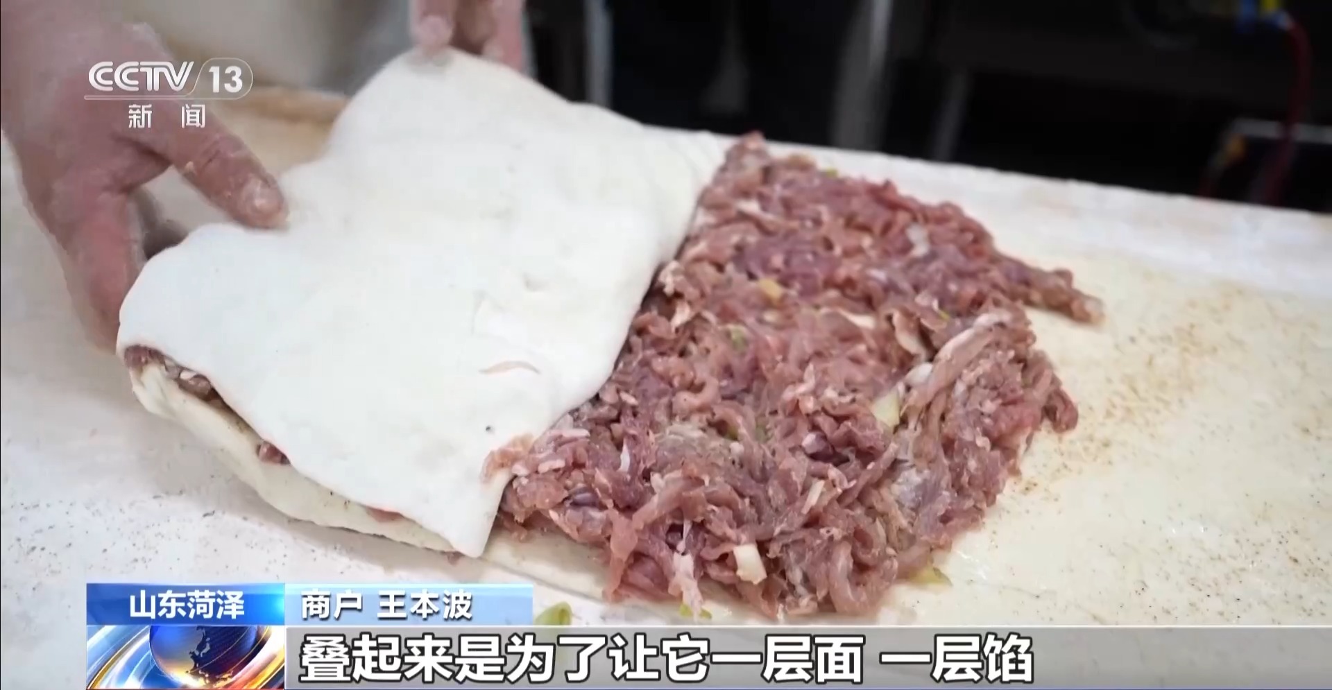 商户 王本波:壮馍要是做得比较好吃,一定要把肉摊到边,皮也擀得特别薄,叠起来是为了让它一层面,一层馅,比较好吃,吃着有层次感。