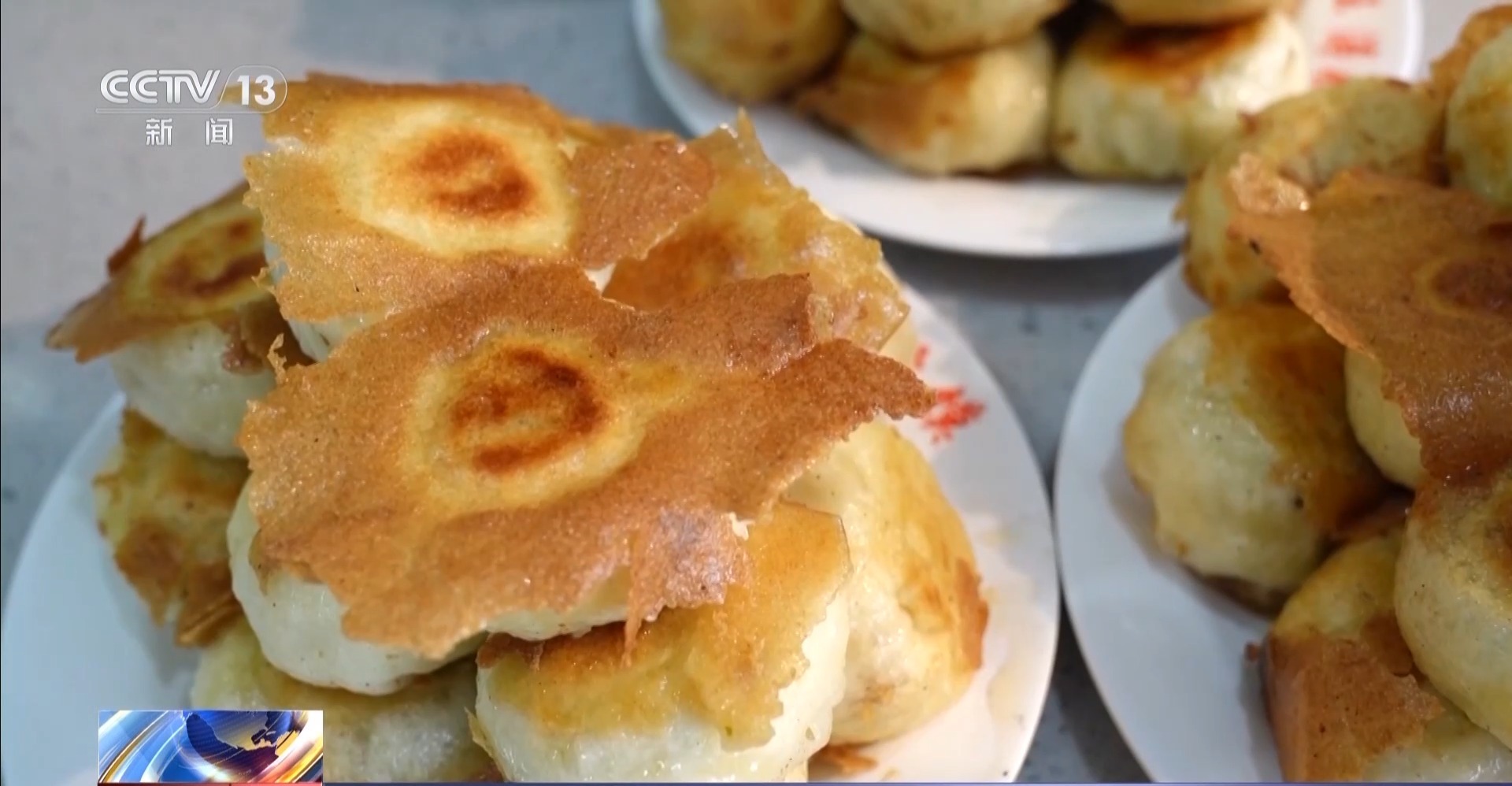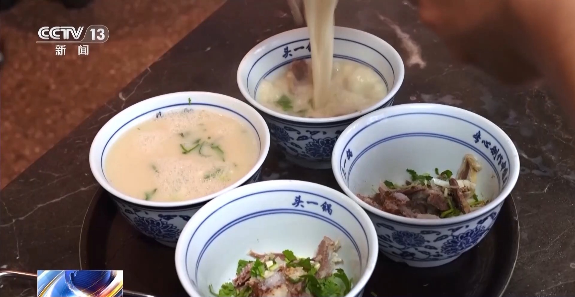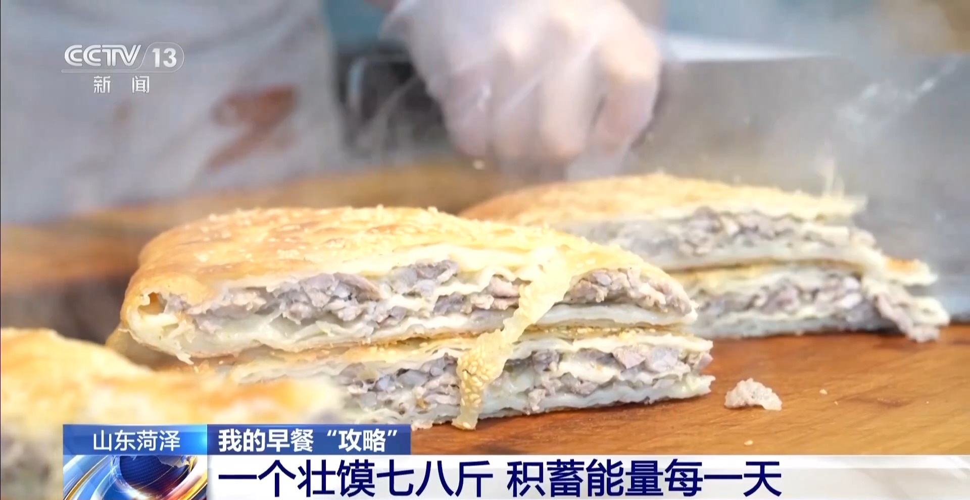 总台记者 李美慧:当地人告诉我,在菏泽吃早餐,最好是一份主食再搭配一碗汤。比如说这份刚出锅的壮馍,它的好搭档就是这碗焖子汤。可以看到刚出锅的壮馍饼皮特别酥脆,里边裹着满满的馅料,一口咬下去,油香、面香跟馅料的香味就会混合在一起,口感特别扎实。这碗焖子汤里边也特别丰富,除了有焖子,里边还有木耳、鸡蛋,它的酸辣味会更突出,刚好可以用来解腻。