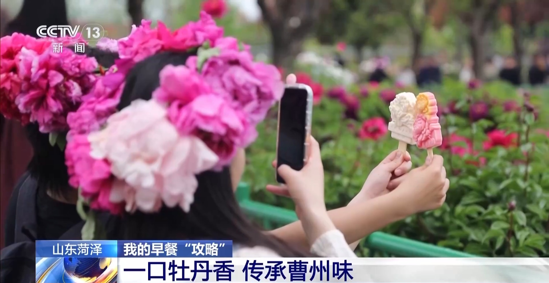总台记者 李美慧:在菏泽,牡丹花可以说是一张金名片,像我身旁这片牡丹花都是各有风采。那我的手上还有一朵特别的牡丹花,它不仅漂亮,而且是一道美食。