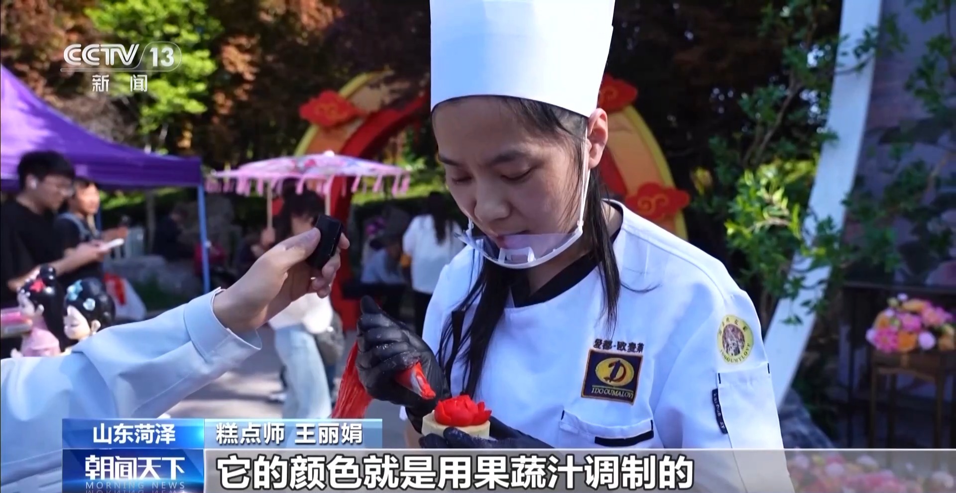 糕点师 王丽娟:这是纯手工制作而成的,里面的馅有牡丹花瓣。它的颜色就是用果蔬汁调制的,就像新鲜的牡丹花慢慢地绽放开来。