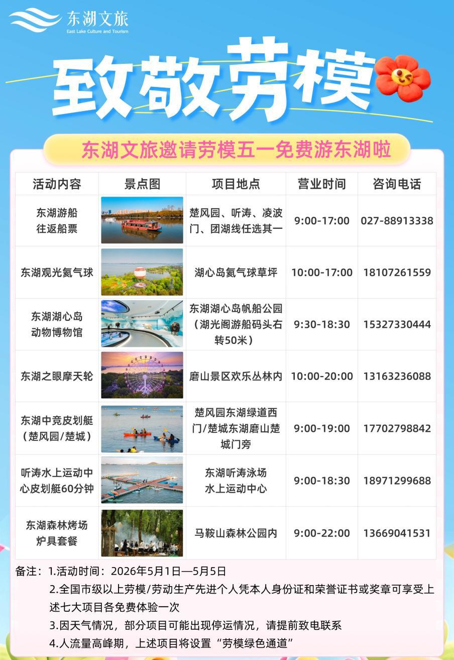 “五一”黄金周期间,武汉东湖文旅面向全国市级及以上劳动模范、五一劳动奖章获得者、劳动生产先进个人开放免费福利,符合条件的劳模凭荣誉证书或奖章及本人身份证,在东湖游船、东湖氦气球、东湖之眼摩天轮、湖心岛动物博物馆、听涛皮划艇、中竞桨板/皮划艇、东湖森林烤场项目等售票窗口核验无误,即可通过劳模绿色通道,免费体验以上七大核心文旅项目各1次。