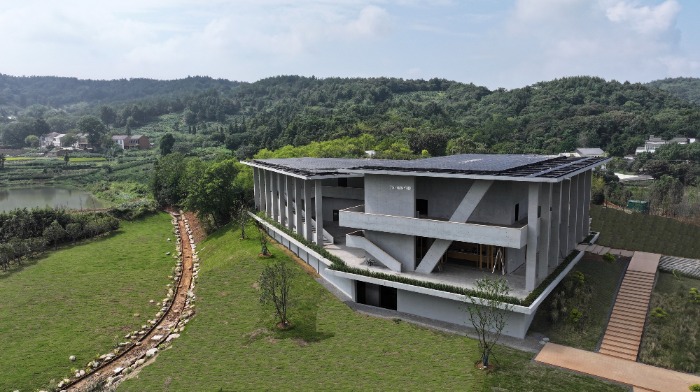 穿过山间小径,走进绿色山谷,一座风格独特的现代建筑映入眼帘。这里是庐江县万山电影公园,国内首家院线同步的乡村艺术影院,包含影院主体、山谷茶室、三个停车场以及景观、露营地等相关配套设施。