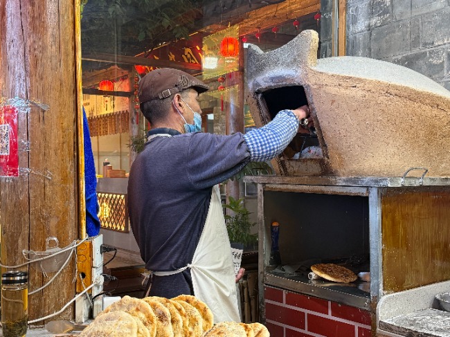在早餐街,下塘烧饼的炉火正旺。一位老师傅手持长长的铁钳,熟练地从穹形烤炉中夹出一块金黄的烧饼。烧饼表面芝麻密布,外壳焦香酥脆。“下塘烧饼用的是‘天锅地灶’,贴饼要反手一甩,靠的是数十年积淀的手艺。”拿起一块,轻轻一掰,“咔嚓”声清脆入耳,面香和芝麻香瞬间弥漫开来。