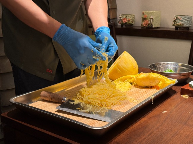 “春晚之后,确实有不少人专门来品尝这道美食。”说着,他将一个金丝绞瓜对半切开,去除瓜瓤,向大家展示金丝绞瓜的做法。只见他左手扶住瓜身,右手顺着瓜皮轻轻揉动,力道轻柔均匀,很快,瓜肉渐渐松散,形成了缕缕金黄的细丝。