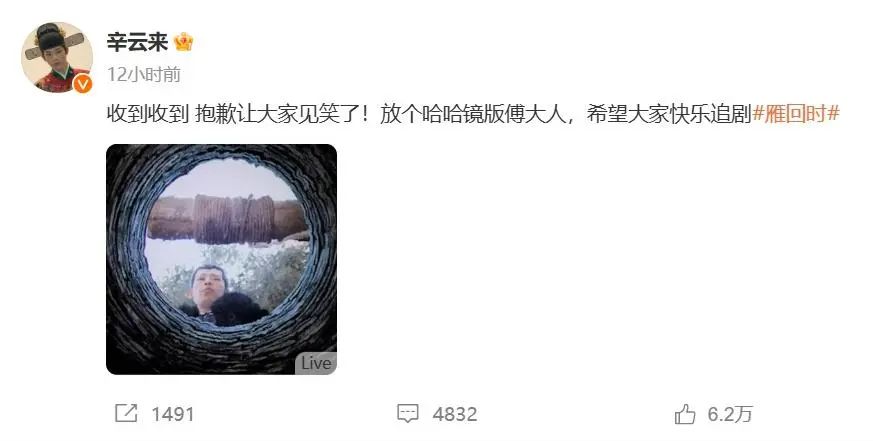 随后,辛云来发文自嘲回应争议:“收到收到,抱歉让大家见笑了!放个哈哈镜版傅大人,希望大家快乐追剧。”