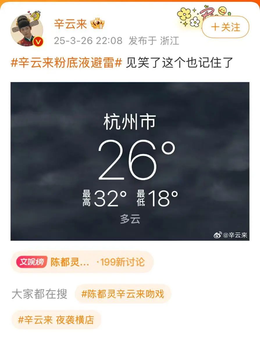 晚上辛云来发文:见笑了这个也记住了!还带上了热搜词条。配图是昨日杭州32℃的高温。