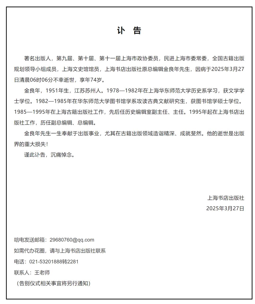 3月27日,记者从“上海书店出版社”微信公众号获悉,著名出版人,第九届、第十届、第十一届上海市政协委员,民进上海市委常委,全国古籍出版规划领导小组成员,上海文史馆馆员,上海书店出版社原总编辑金良年,因病于2025年3月27日清晨06时06分不幸逝世,享年74岁。