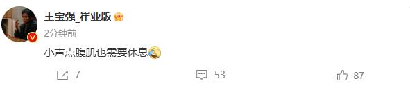 3月27日下午,王宝强在社交平台发文称:“小声点腹肌也需要休息。”