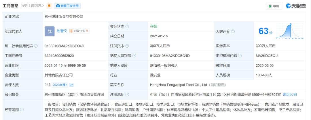 天眼查显示,杭州锋味派食品有限公司成立于2021年1月,法定代表人为陈誉文,注册资本300万元人民币,经营范围包括食品销售、食品进出口、市场营销策划、互联网销售等。股东信息显示,该公司由杭州谦道电子商务有限公司、锋味(北京)食品技术有限公司、北京菲猎电子商务有限公司共同持股。