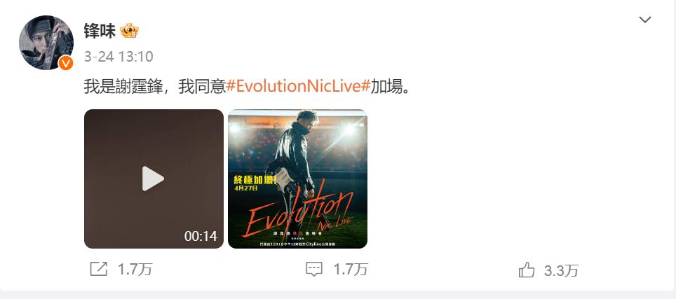 3月24日,谢霆锋又发微博表示同意“EvolutionNicLive”加场,再次引发网友热议,冲上热搜。