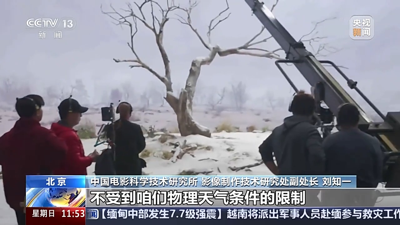 中国电影科学技术研究所影像制作技术研究处副处长刘知一:不受到咱们物理天气条件的限制,包括我们实际物理场景比如说我们今天要拍一个沙漠明天要去海边,那你如果没有这种虚拟环境的话,你要去实景你可能时间都要花在路途上面。