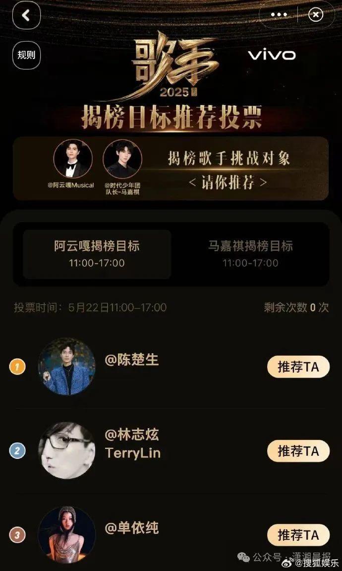 揭榜歌手阿云嘎将从陈楚生、林志炫、单依纯三位中选择一位歌手进行揭榜挑战,时代少年团队长马嘉祺 将从白举纲、GAI周延、单依纯三位中选择一位歌手进行揭榜挑战。