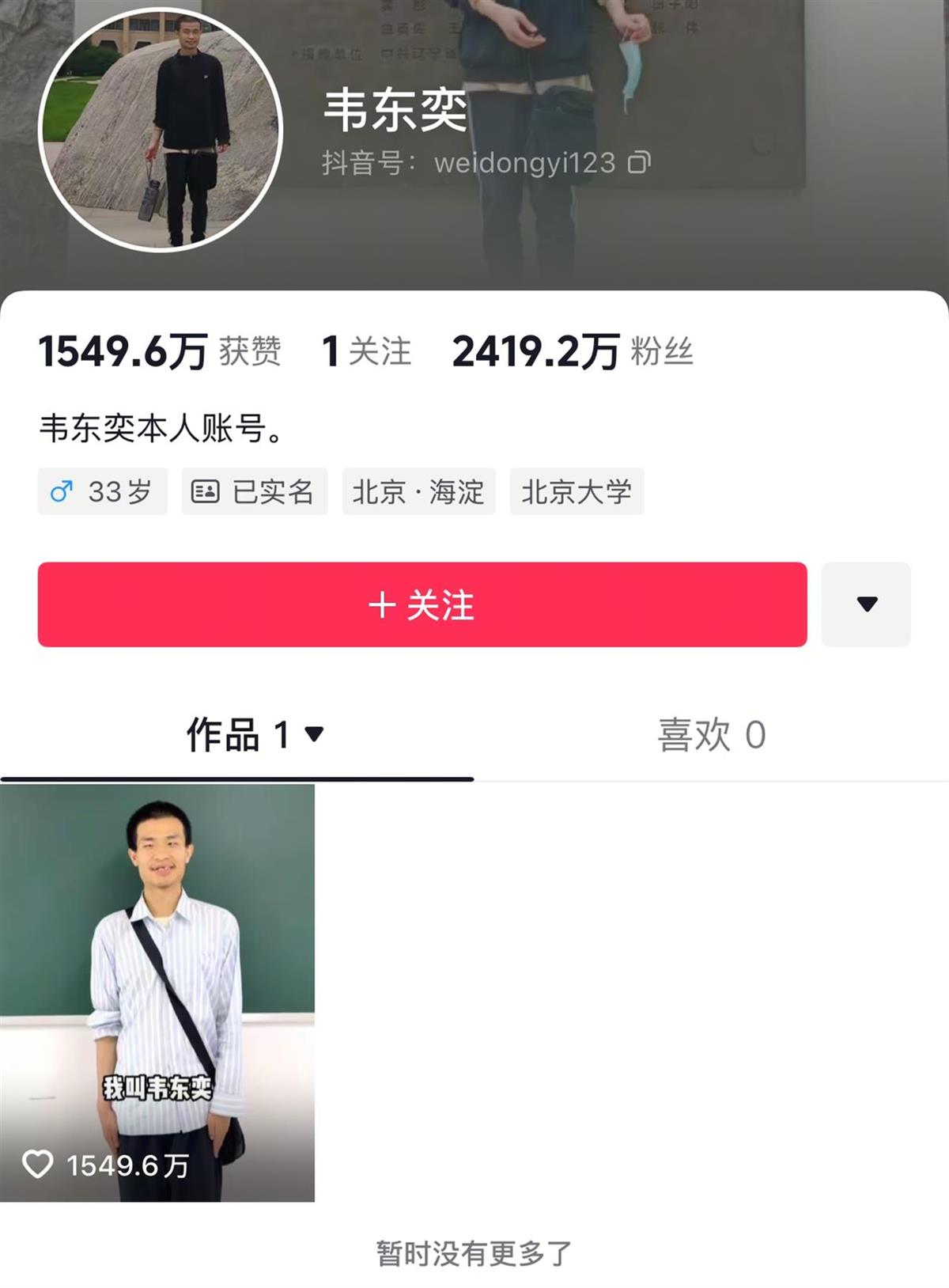 涨粉速度仅次于刘德华的,是北大“韦神”韦东奕。他在72小时内收获1900多万粉丝,目前总粉丝数为2400多万。开通账号后,韦东奕只发布了一条视频,点赞数高达1500多万。