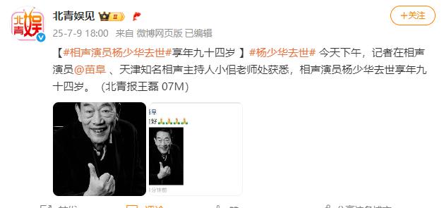 今天下午,记者在相声演员@苗阜 、天津知名相声主持人小佀老师处获悉,相声演员杨少华去世享年九十四岁。(北青报王磊 )