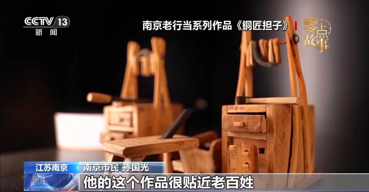 他的作品,全靠榫卯结构拼接木构件,也没有过于精细的打磨和涂彩。一晃十多年过去了,陈老做出了“黄土地”“南京老行当”和“市井烟火”三个系列共两百多件套微型木作,让那些消失的时光在指尖重新“活”过来。
