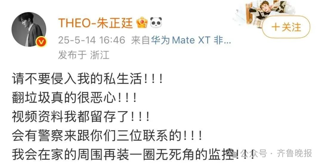 “请不要侵入我的私生活!”、“翻垃圾真的很恶心!”、“上次刚搬的新家有人来,我就搬了!这边新房子刚弄好又来”……5月15日,知名男星@THEO-朱正廷连续发文,怒斥“私生饭”,并表示他已为此报警,之后会在家再装一圈无死角监控。