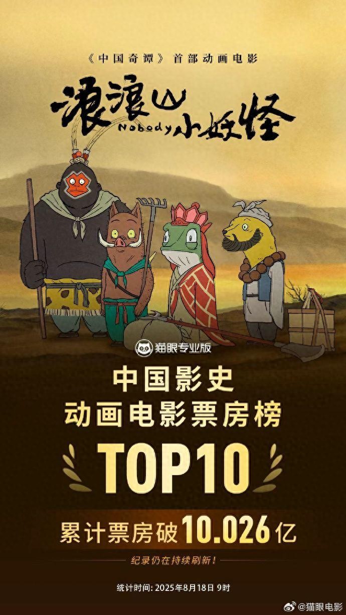 其中,国产动画电影《浪浪山小妖怪》目前累计票房已突破10亿元,进入中国影史动画电影票房榜前十。