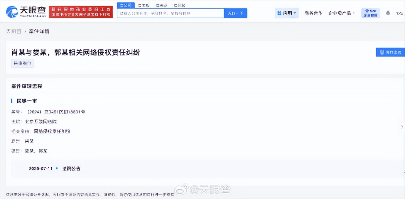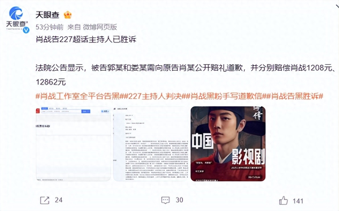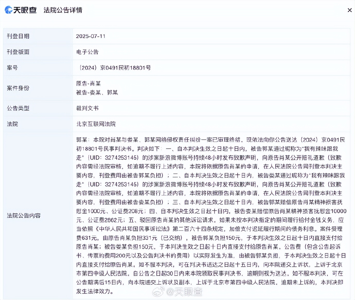 内容显示,法院判决被告郭某和娄某需向原告肖战公开赔礼道歉,并赔偿肖战共1.1万元等。