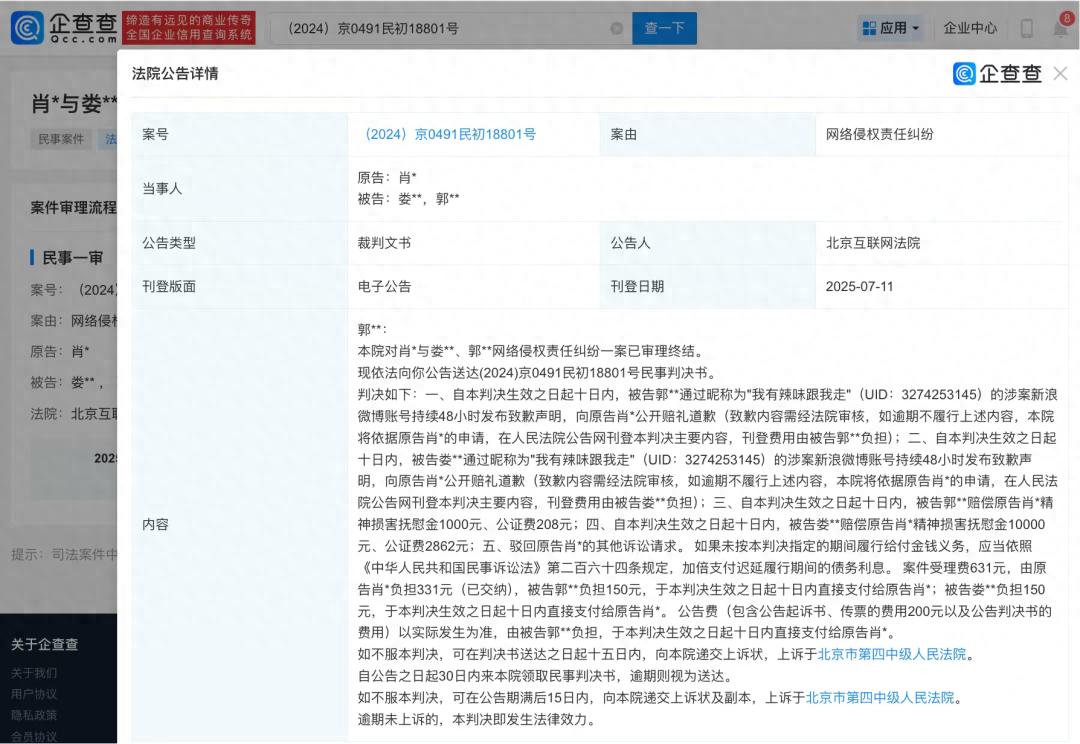 企查查信息显示,近日,北京互联网法院向郭某公告送达肖战与娄某、郭某相关网络侵权责任纠纷案件民事判决书。内容显示,法院判决被告郭某和娄某需向原告肖战公开赔礼道歉,并赔偿肖战共1.1万元等。据多位肖战粉丝发文,被告系227超话主持人。