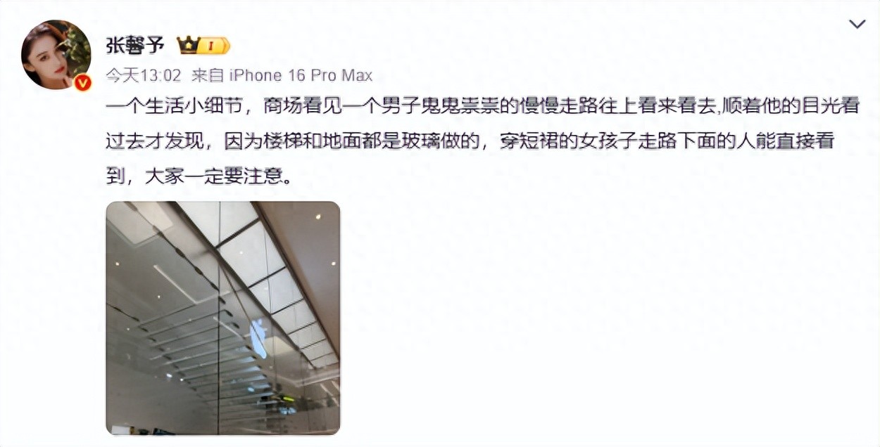 一个生活小细节,商场看见一个男子鬼鬼祟祟的慢慢走路往上看来看去,顺着他的目光看过去才发现,因为楼梯和地面都是玻璃做的,穿短裙的女孩子走路下面的人能直接看到。她提醒“大家一定要注意。”