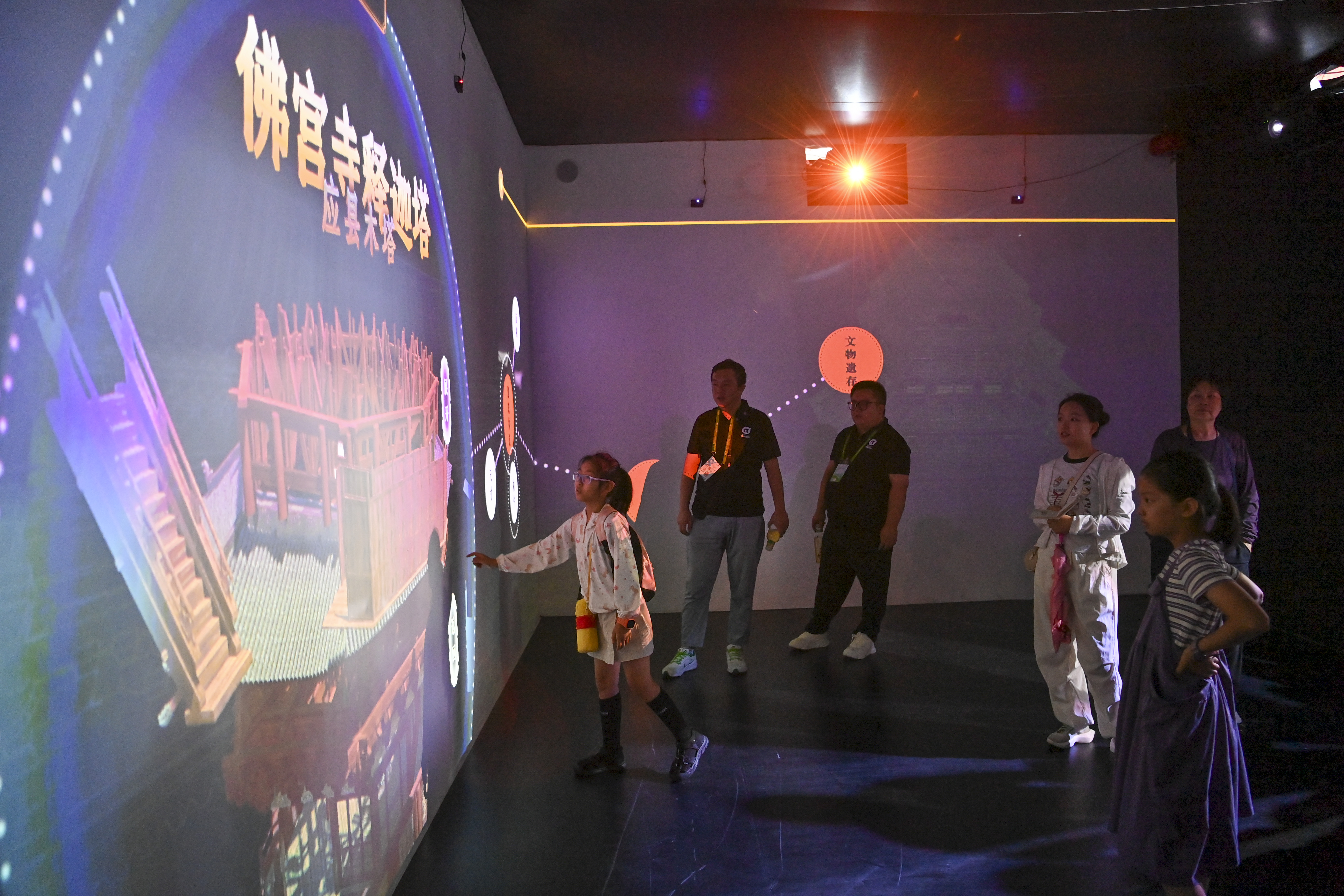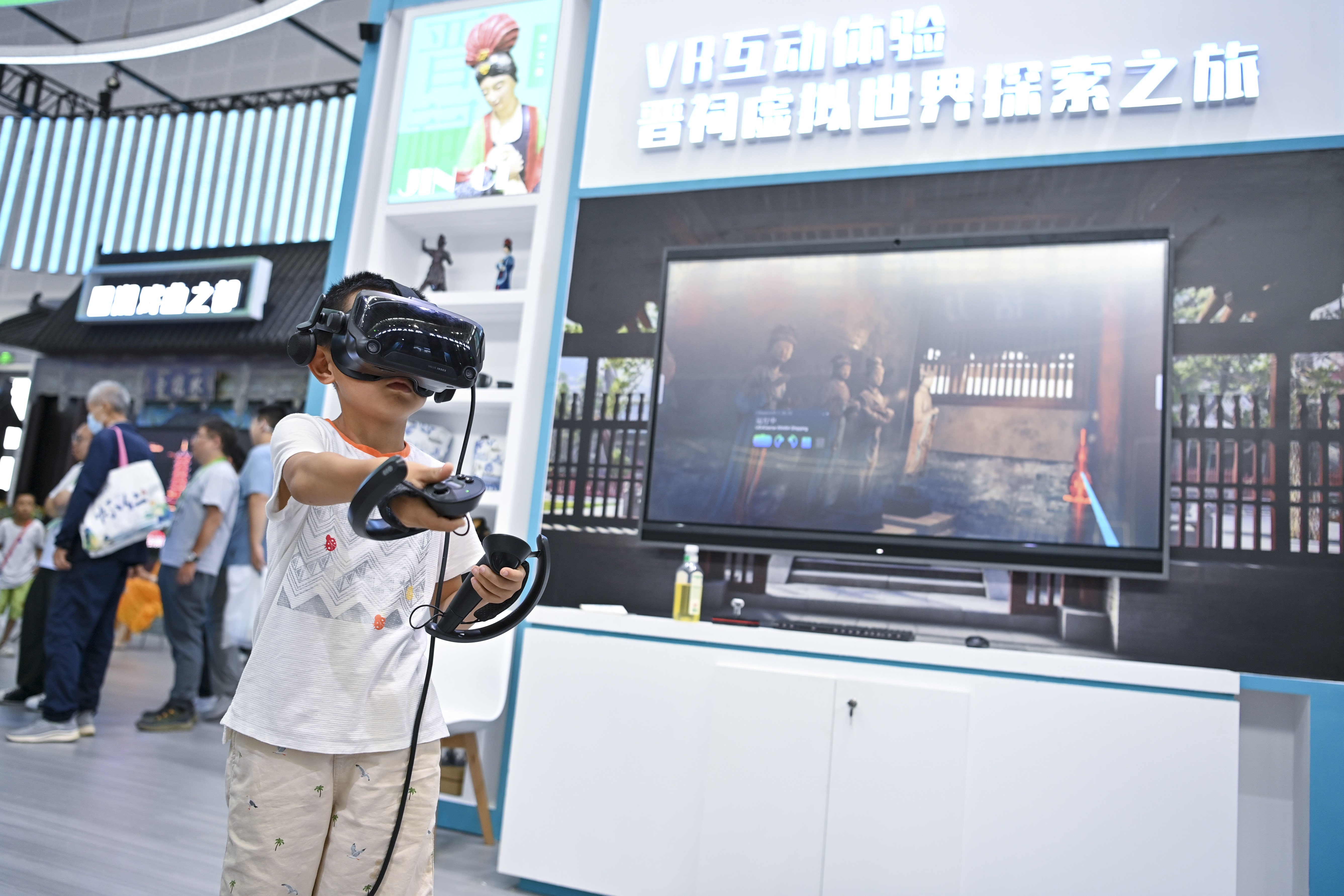 8月21日,一位小朋友在第七届山西文化产业博览交易会上通过VR设备游览晋祠。新华社记者 杨晨光 摄
